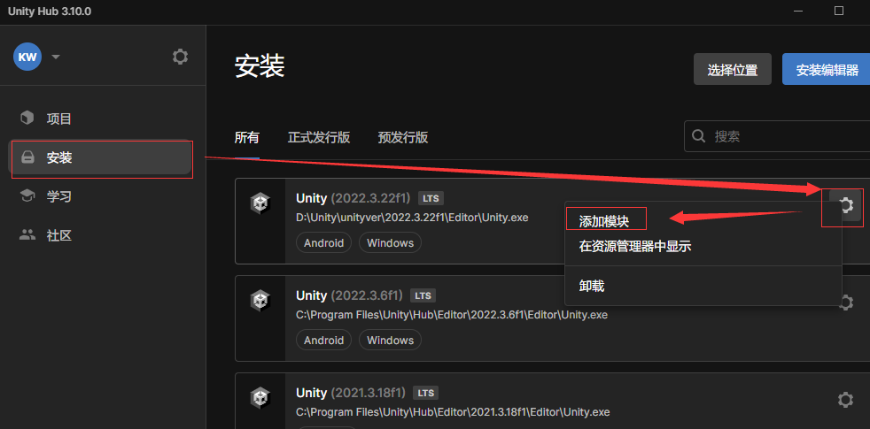 然后就是下载指定版本的Unity编辑器,这在官方文档中也会指定版本,千万不要使用C1的中国版编辑器(在本篇教程编写时使用的unity版本是2022.3.22f1而不是2022.3.22f1c1)