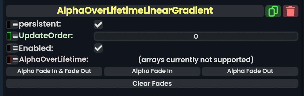 AlphaOverLifetimeLinearGradient(生命周期线性渐变透明度)组件实现了源自 Unity 的早期生命周期透明度系统。它允许粒子的透明度(Alpha 值)根据其已存活的时间而发生改变。