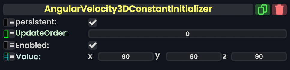 (译者注:原文此处存在错误。根据组件名和下方字段描述,此处实际指代的应是 AngularVelocity3DConstantInitializer,即“3D 恒定角速度初始化器”组件,其作用是使粒子在各轴向上具有固定的初始旋转角速度,而非随机。)