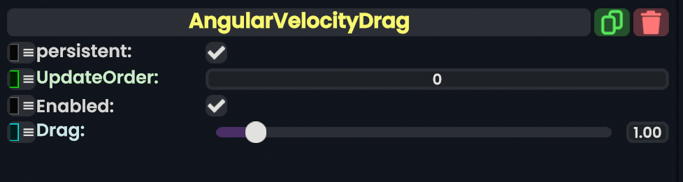 Angular Velocity Drag(角速度阻力)组件会随着时间的推移不断减少粒子系统中粒子的角动量(即逐渐减缓粒子的旋转速度)。