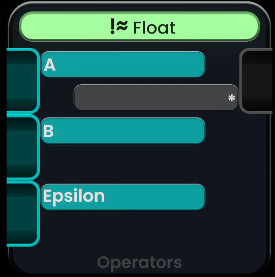 !≈ (Approximately Not)(近似非)节点接收两个值,它们可能在一定 Epsilon 范围内足够接近。如果这些值被认为不够接近,此节点将返回 true。