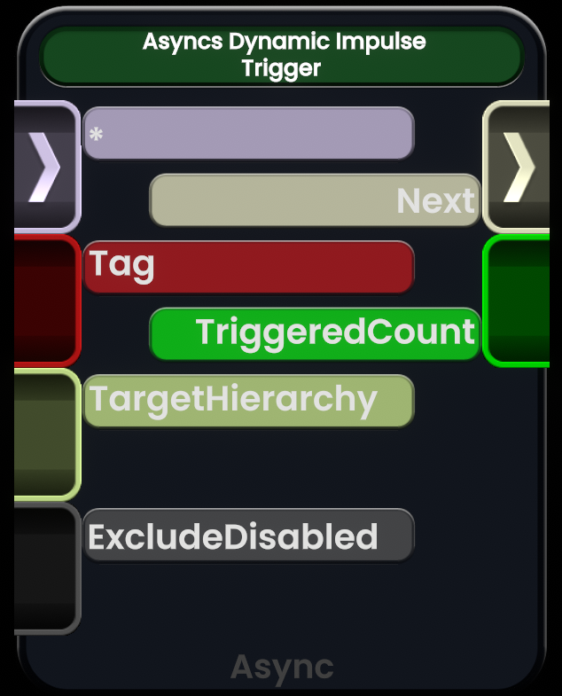 Async Dynamic Impulse Trigger(异步动态脉冲触发器)节点在指定的 TargetHierarchy 下,向所有匹配给定 Tag 的 Async Dynamic Impulse Receiver(异步动态脉冲接收器)发送一个异步动态脉冲。
