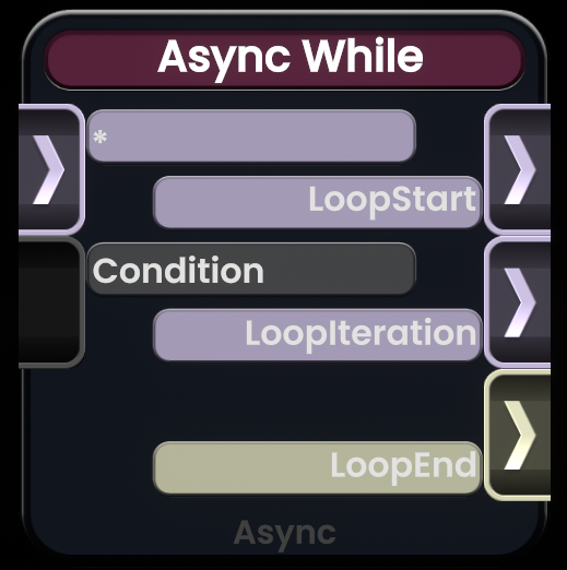 Async While(异步循环)节点是 While 节点的异步变体。它用于执行循环操作,允许在条件保持为真时持续触发脉冲。