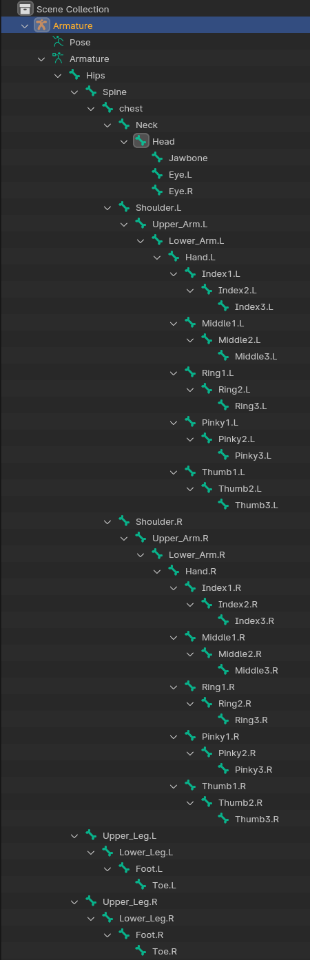 Resonite 使用模式匹配和启发式算法来识别模型的骨骼布局。这意味着骨骼名称在很大程度上是不区分大小写的,并且可以在名称周围包含额外数据。