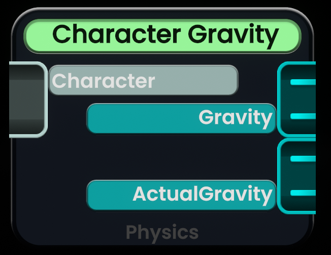 Character Gravity(角色重力)节点返回引用的 CharacterController(角色控制器)的重力。Gravity 输出用于获取角色控制器在模拟时旨在达到的当前重力。Actual Gravity 是角色控制器当前正在模拟的重力,根据角色控制器上的设置(特别是重力比例字段),其值可能会有所不同。