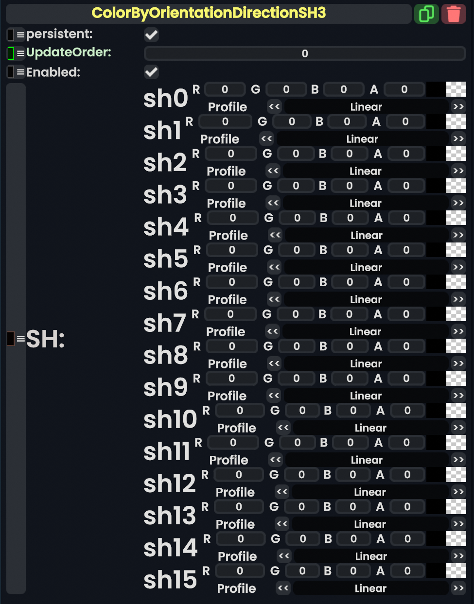 Color By Orientation Direction SH3 组件会根据粒子在其模拟空间(Simulation Space)中的朝向向量(Orientation Vector),来对 ColorX 球谐函数(Spherical Harmonic)进行采样。采样所得的颜色将成为该粒子的颜色。