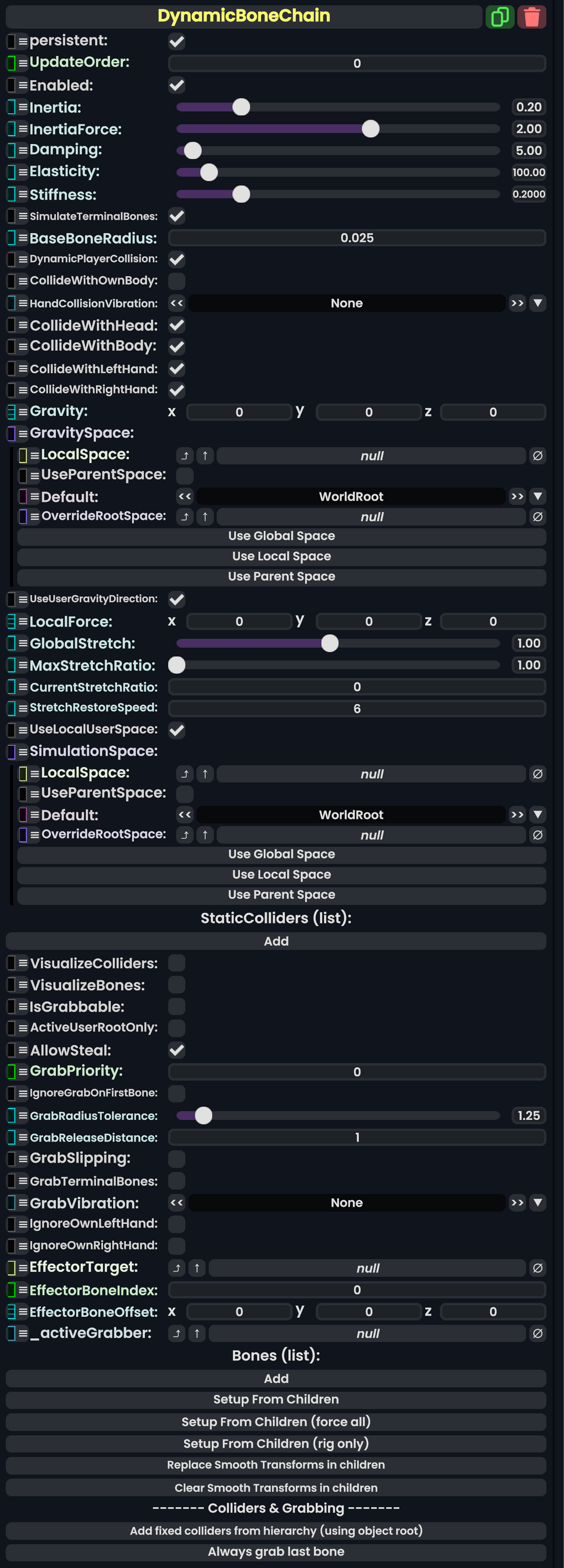 Dynamic Bone Chain 是一个允许你为已绑定模型或化身(Avatar)的骨骼添加刚体(Rigidbody)物理效果的组件。拥有刚体物理特性的骨骼被称为“动态骨骼”;该名称源自一个提供类似功能的 Unity 插件。
