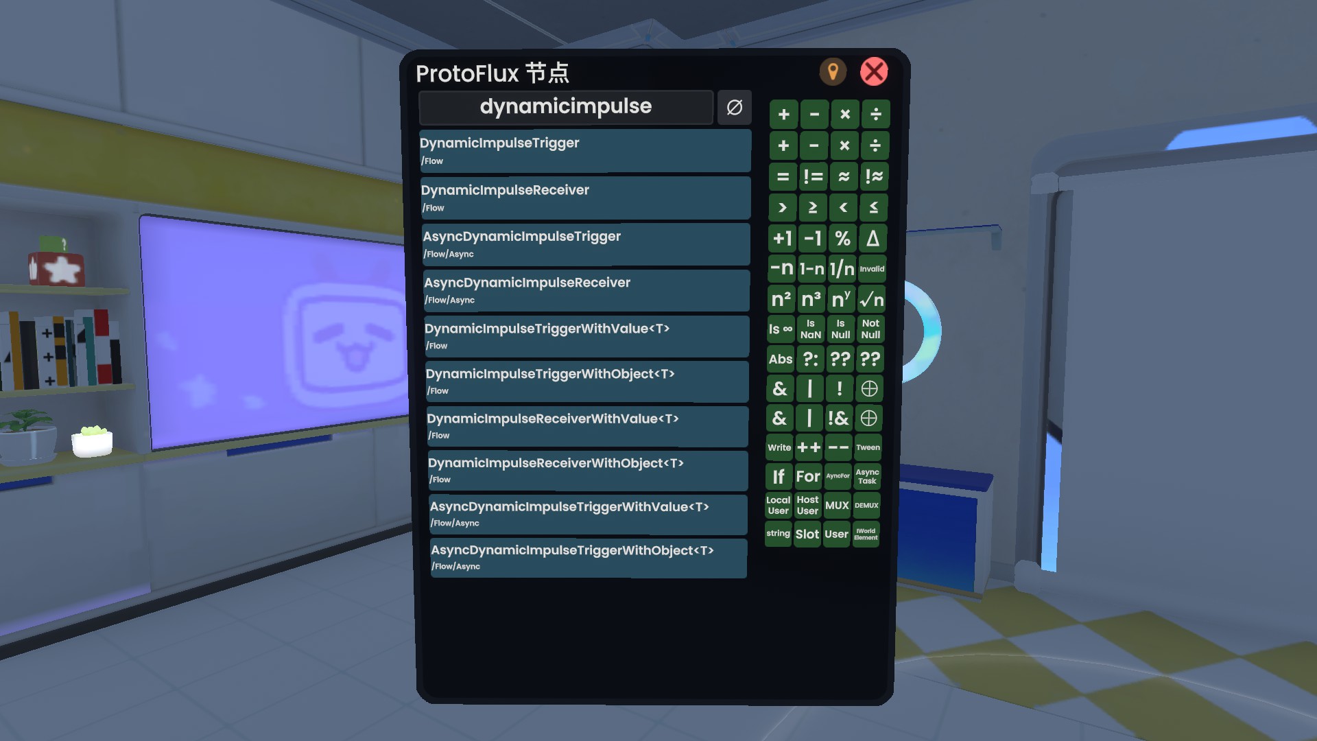 Dynamic Impulses(动态脉冲)允许 Impulses(脉冲)传播到世界中任意位置的其他 ProtoFlux 程序中,这使得可以用简单的模块构建大型、复杂的程序。