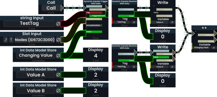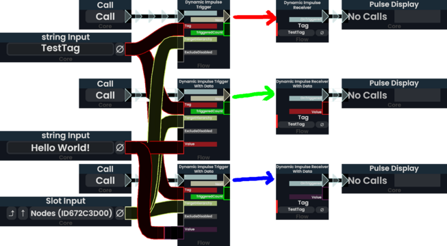 此外,动态脉冲还可以携带单个值或引用。能够实现此功能的 ProtoFlux 节点包括 Dynamic Impulse Trigger With Data 和 Dynamic Impulse Receiver With Data。也有对应的组件变体,如 Button Dynamic Impulse Trigger With Reference 和 Button Dynamic Impulse Trigger With Value。数值由触发器发送,并由接收器接收。