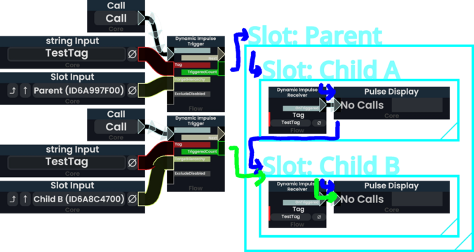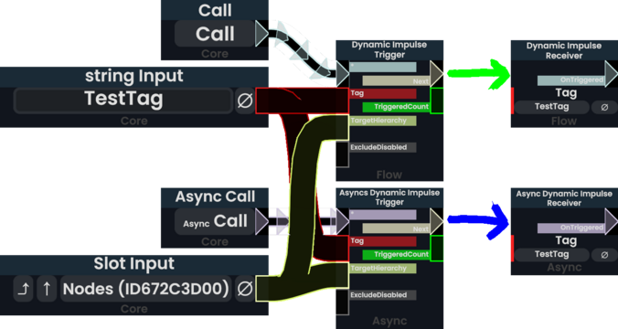 当 ASync Dynamic Impulse Trigger 收到脉冲时,它会等待(Await)它找到的每一个 ASync Dynamic Impulse Receiver。接收器被触发的顺序是深度优先搜索(Depth first search)。只有当此搜索完成且每个异步接收器都已完成执行(也称为 Awaiting/等待完成)后,Next 输出端才会被触发。