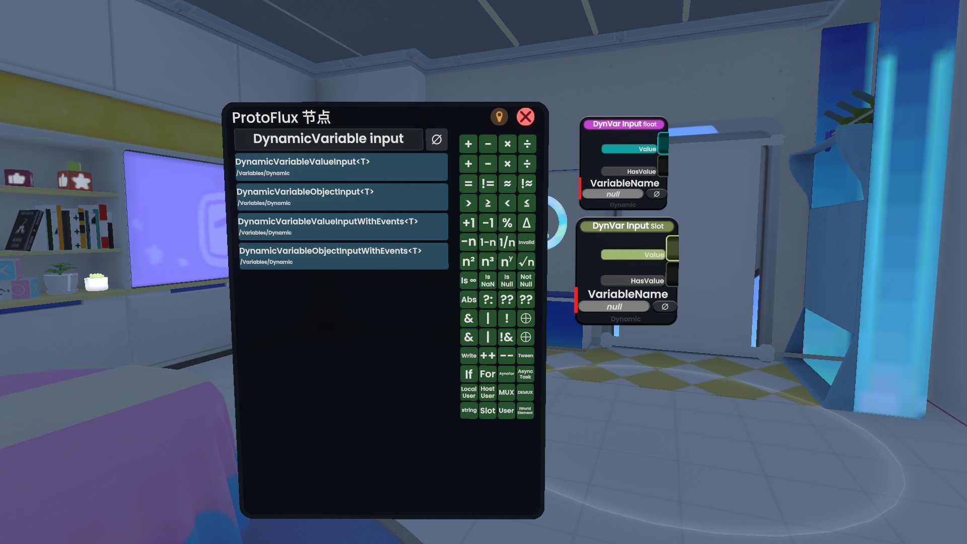 Dynamic Variable Input 是一个 ProtoFlux 节点,它能够像 Dynamic Variable Driver Component(动态变量驱动器组件)一样,从 Dynamic Variable Space(动态变量空间)中读取数据。它使用节点所在的 Slot 作为读取点来获取动态变量的值。如图所示。