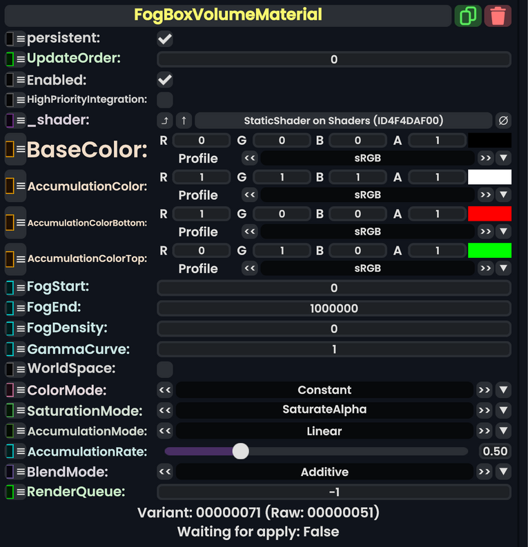 Accumulation(枚举) | 控制雾气浓度随深度增加的计算方式(详情见下文)。 |