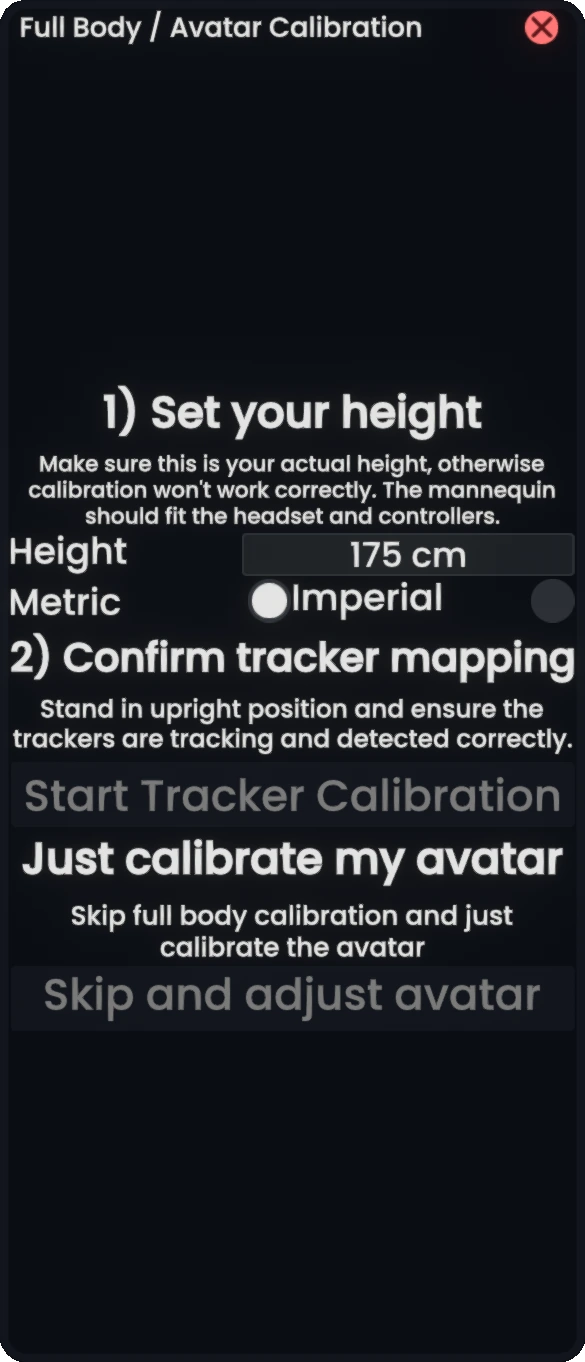 全身校准应通过“全身校准器(Full Body Calibrator)”完成。不建议通过设置菜单进行校准,因为这样做会导致系统随机固定用户位置,且难以操作。