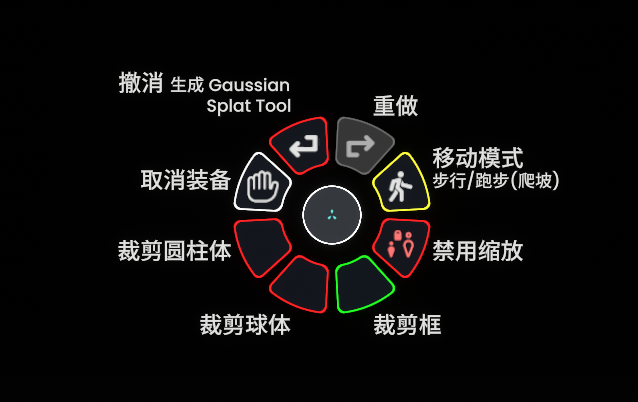Gaussian Splat Tool 可以像任何标准工具一样被装备。使用主键(Primary)可以创建一个用于裁剪的选择框、球体或圆柱体。按下次键(Secondary)将激活裁剪功能,边界范围内的任何内容都将被保留,并作为新的 Gaussian Splat(高斯泼溅模型)重新导入。