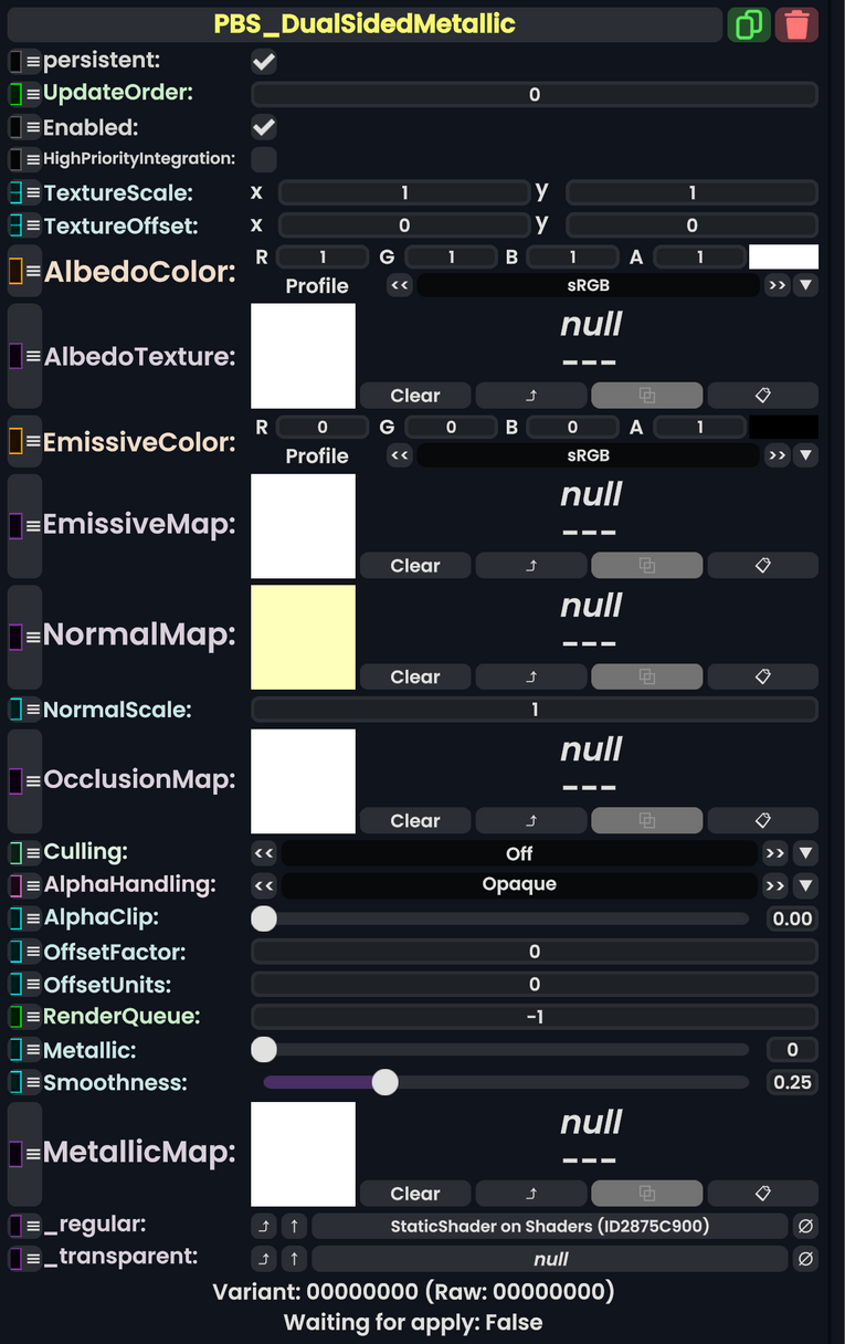 | _regular | AssetRef<Shader> | 常规着色器:用于不透明渲染的着色器变体(内部)。 |