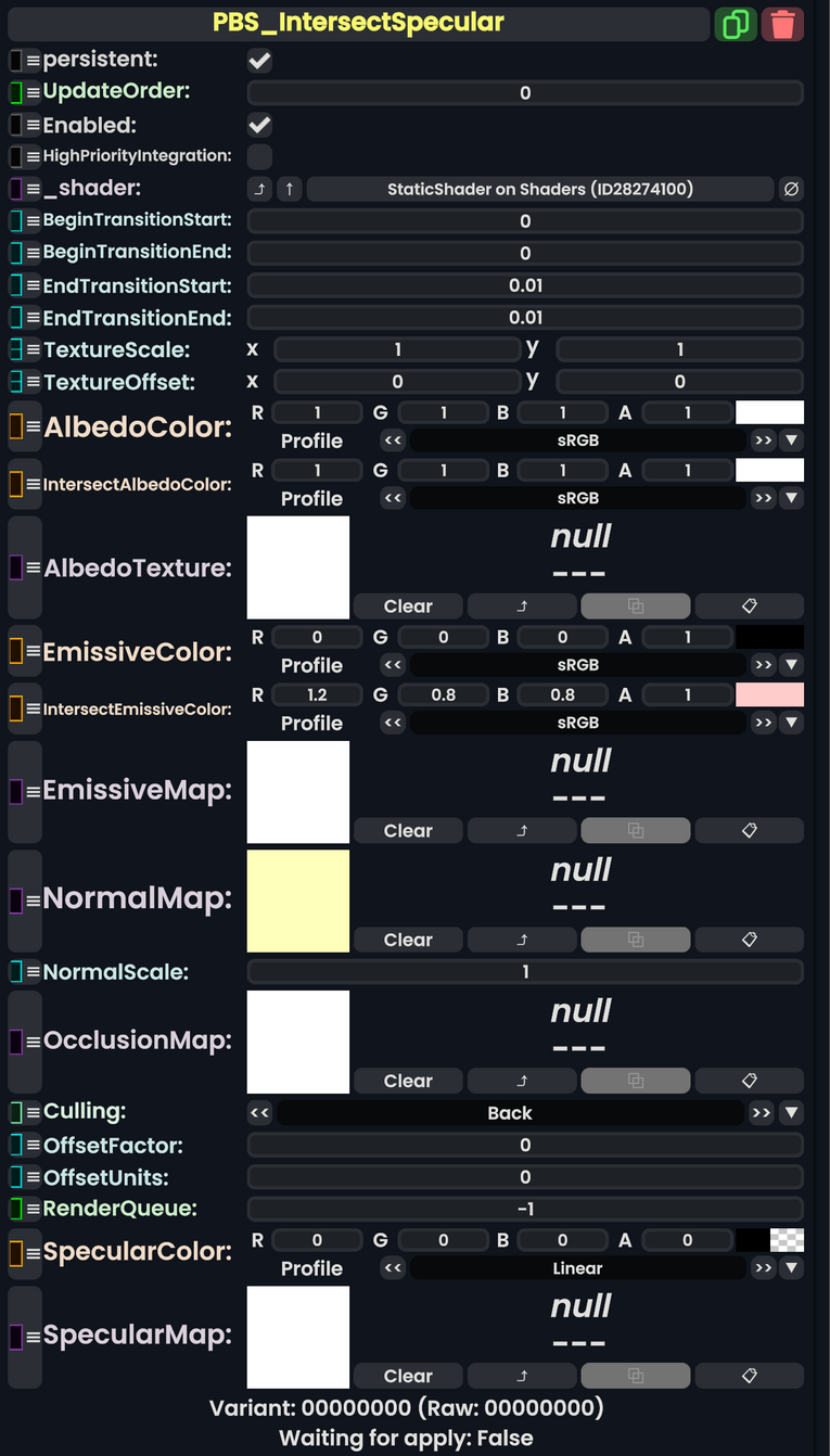 | IntersectEmissiveColor | ColorX | 相交自发光颜色:相交区域显示的自发光颜色(用于轮廓效果)。 |