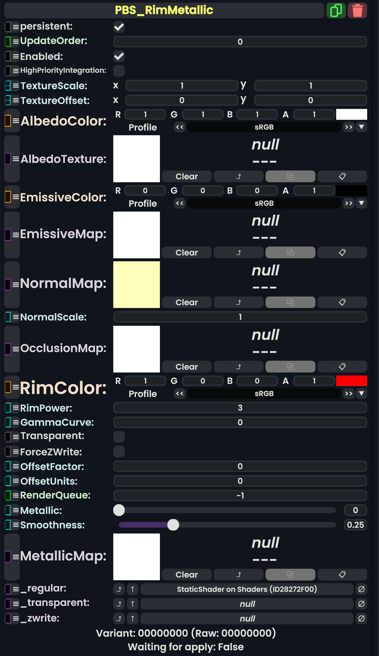 | RimColor | ColorX | 边缘光颜色:从摄像机视角观察时,物体边缘发光的颜色。 |