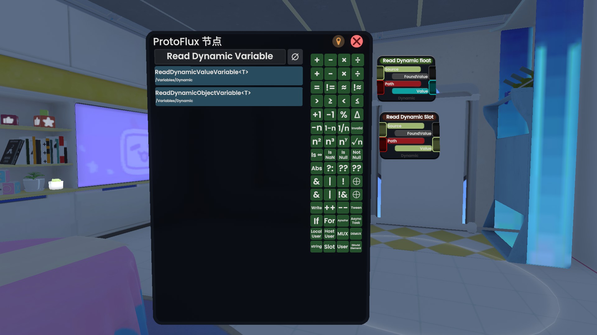 Read Dynamic Variable 节点以一个 Slot(插槽)作为源,并在层级结构中查找包含指定路径的第一个 Dynamic Variable Space(动态变量空间)。如果找到了匹配的类型,它将返回该值。更多信息请参阅 Dynamic Variables(动态变量)。如图所示。