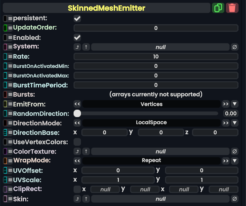 Skinned Mesh Emitter(蒙皮网格发射器)组件可用于从 SkinnedMeshRenderer(蒙皮网格渲染器)的顶点(Vertices)、边缘(Edges)或面(Faces)上发射粒子。粒子的颜色可以设置为纹理上特定点的颜色,该颜色是通过粒子在蒙皮网格渲染器上的发射位置对应的 UV 坐标进行采样得出的。