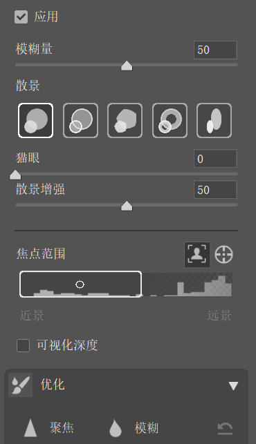 在最开始的界面向下拉,您能找到“镜头模糊”,这一板块是模拟了现实中相机的对焦效果,通过图像识别自动添加景深、散景效果,然后您在此基础上可以用最下方的“优化”进行手动修改细节。