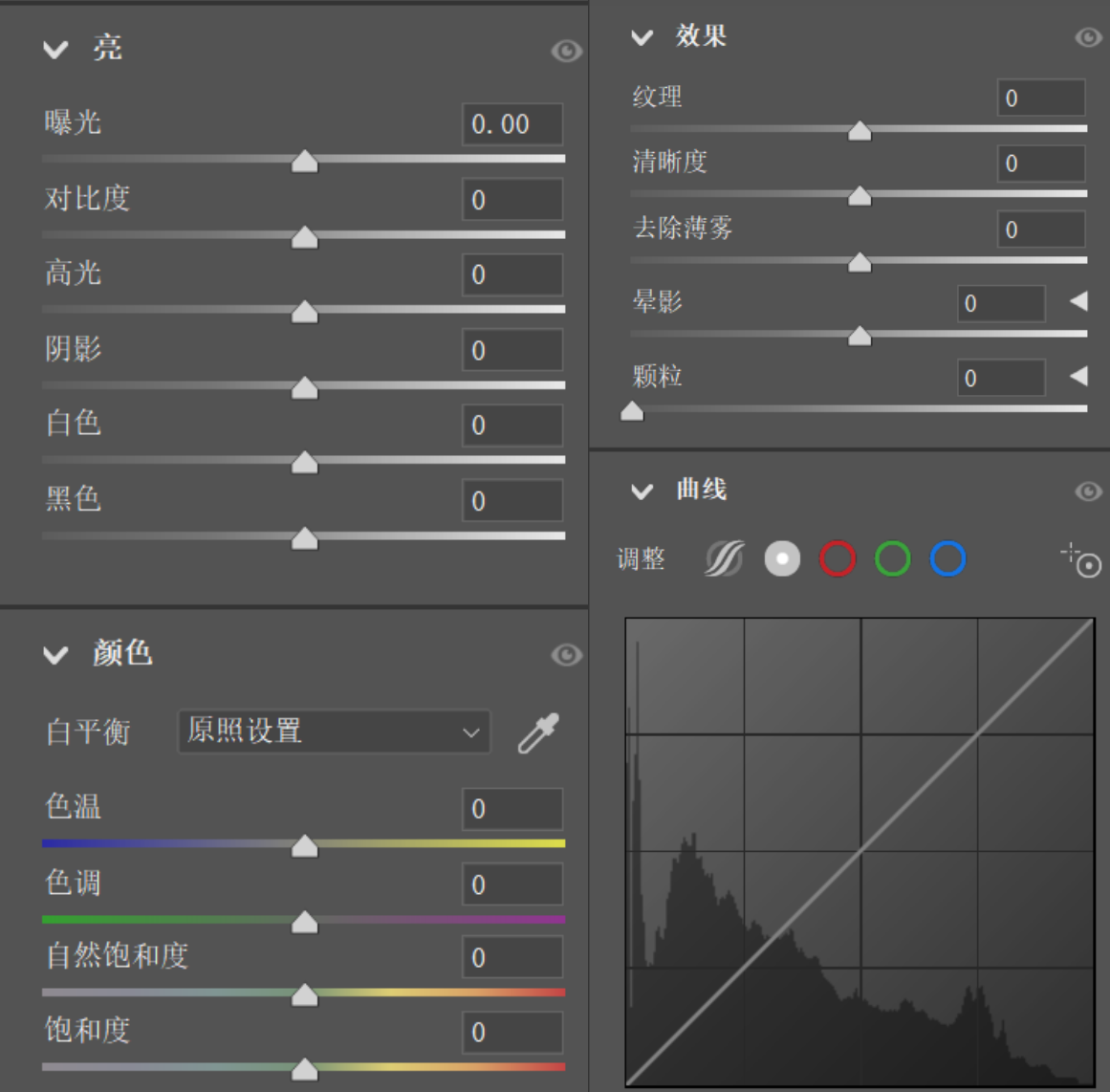 您可以从亮度系列、色彩系列、效果系列、颜色曲线四方面来调整画面,相当于醒图的快速调节或者手机上自带的照片后期调节,不用再用各种快捷键和窗口来调整图像了。