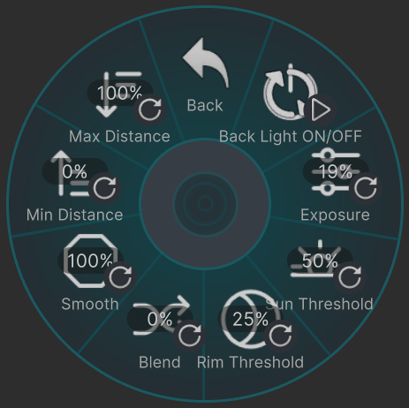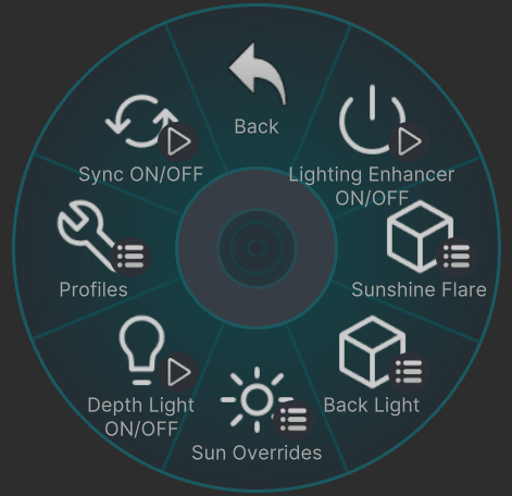 在您按照上述方法导入后,找到您模型的轮盘菜单-->LightingEnhancer来使用。使用按钮“Lighting Enhancer ON/OFF”来开启。接下来,我将逐按钮为您介绍功能和使用方法。