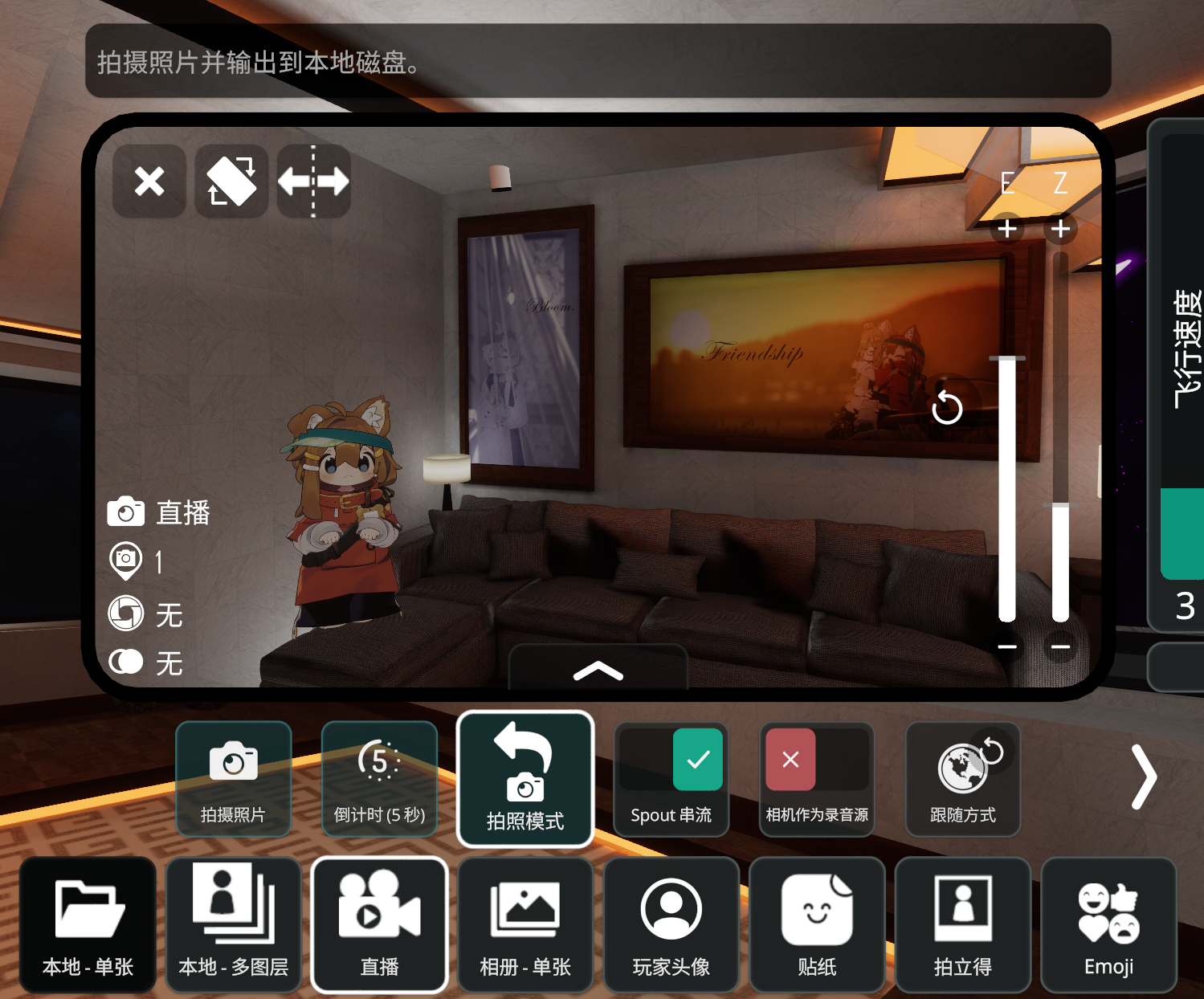 来到VRChat,切换“拍照模式”为“直播模式”,并且勾选“Spout 串流”。此时您在OBS中应该就可以正常看到画面了。