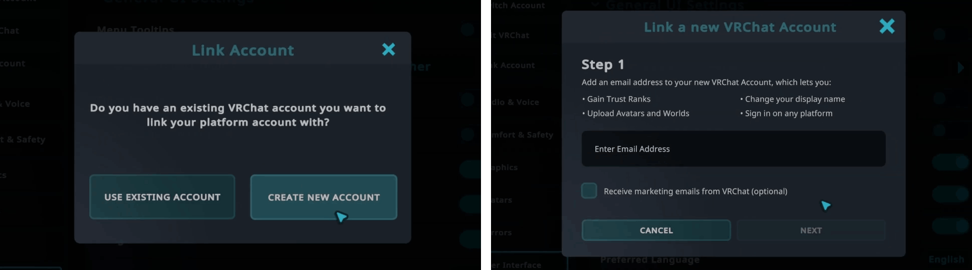 如果你还没有 VRChat 账号,想要将现有的账号升级为 VRChat 账号,请案照以下方式操作: