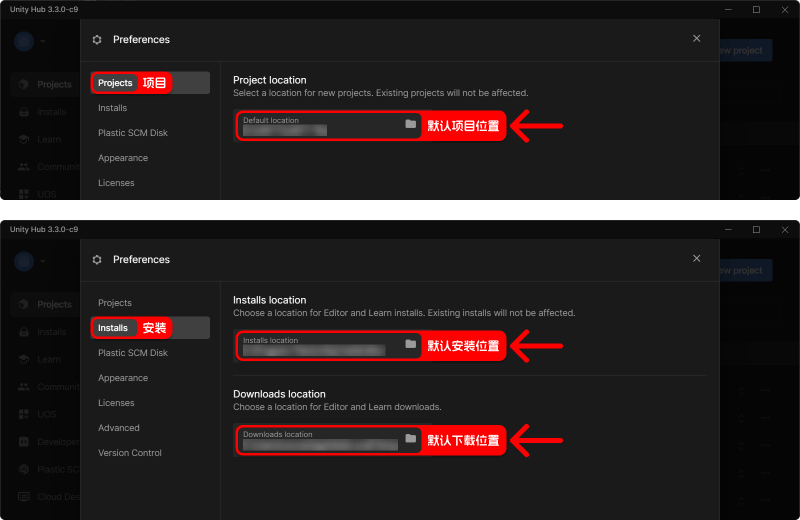 在设置界面中你可以调整项目的默认位置路径,下载/安装 Unity 编辑器的默认路径,你可以尽情修改这三个位置到自己想让文件待着的地方。