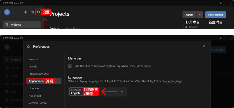 2、在 Language(语言)中选择简体中文,即可将 Unity Hub 切换为中文模式。